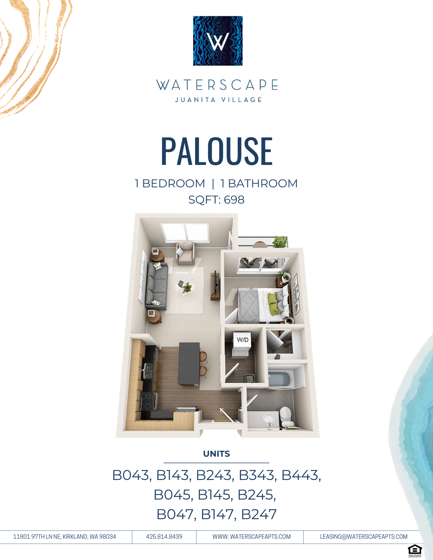 Welcome to Waterscape at Juanita Village, a vibrant lakeside community nestled in the heart of Kirkland. These thoughtfully designed apartment homes offer the perfect blend of comfort, convenience, and urban charm, with stunning views of Lake Washington. Each residence features spacious layouts, upscale finishes, and private patios or balconies- ideal for enjoying the serene surroundings. With waterfront trails, local cafés, boutique shopping, and entertainment options just blocks away, Waterscape delivers a modern living experience in one of the area’s most sought-after neighborhoods.